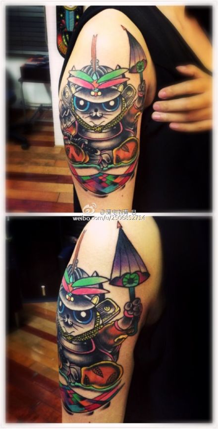 手臂时尚很帅的一款的猫咪武士纹身图案