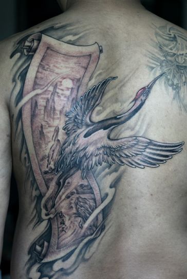 背部白鹤仙鹤丹顶鹤纹身图案大全