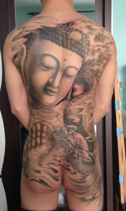 时尚帅气的满背观音与龙纹身图案