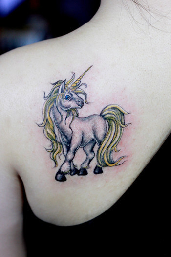 女生肩背一款唯美经典的独角兽纹身图案