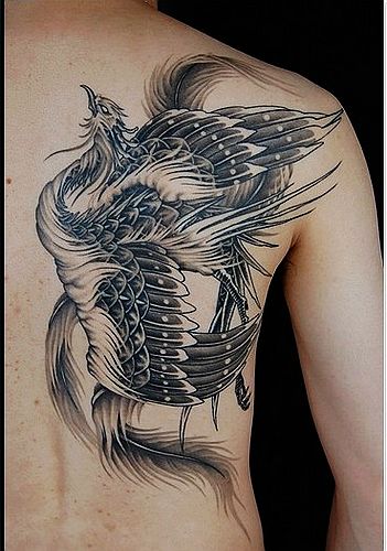 武汉专业文身店:后背黑白凤凰纹身图案图片大全
