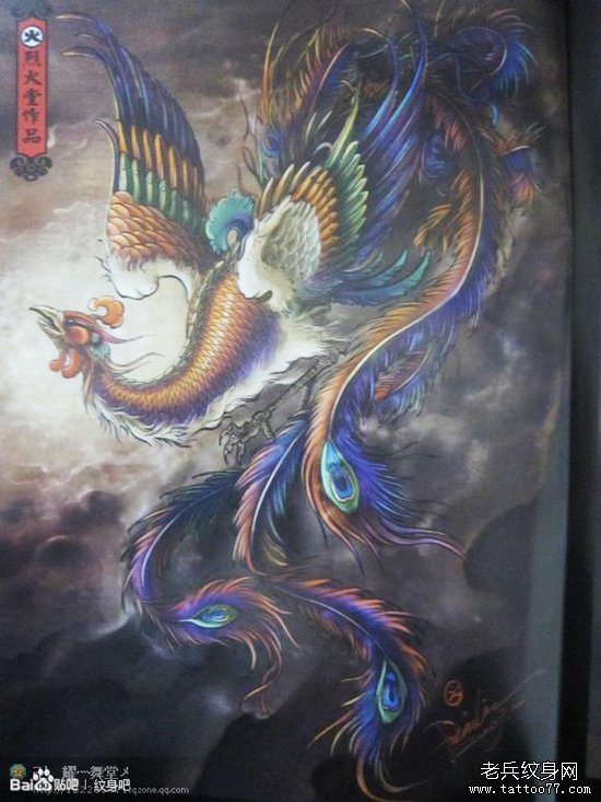 一款漂亮精美的彩色凤凰纹身手稿