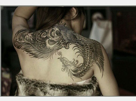 女生后背时尚潮流的黑灰凤凰纹身图案