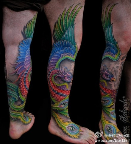 腿部好看经典的传统凤凰纹身图案