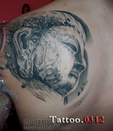 肩背一款石雕佛头纹身图案 肩背一款石雕佛头纹身图案
