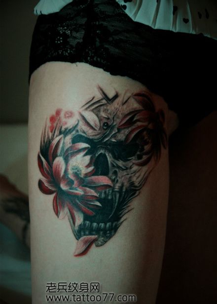 女孩子腿部超酷的一款骷髅莲花纹身图案