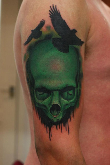 男人手臂帅气的彩色骷髅与图腾老鹰纹身图案