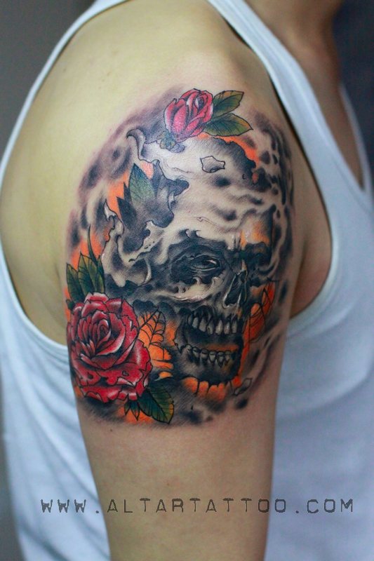 男人手臂帅气超酷的欧美骷髅与玫瑰花纹身图案
