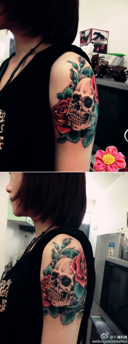 女生手臂潮流经典的一款骷髅与玫瑰花纹身图案
