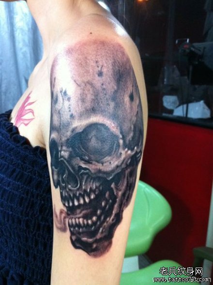 女生手臂一款潮流经典的黑灰骷髅纹身图案