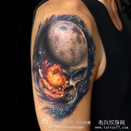 手臂帅气经典的彩色星空骷髅纹身图案
