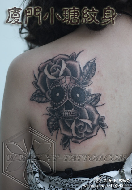 女生后肩背唯美小巧的黑灰骷髅与玫瑰纹身图案