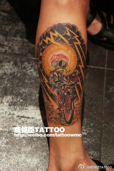 腿部一款时尚很酷的骑自行车的骷髅纹身图案