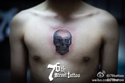 男人胸前时尚经典的黑灰骷髅纹身图案