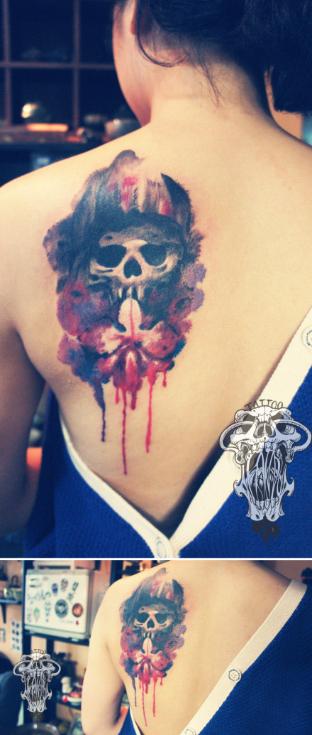 女生肩背时尚经典的骷髅与兰花纹身图案
