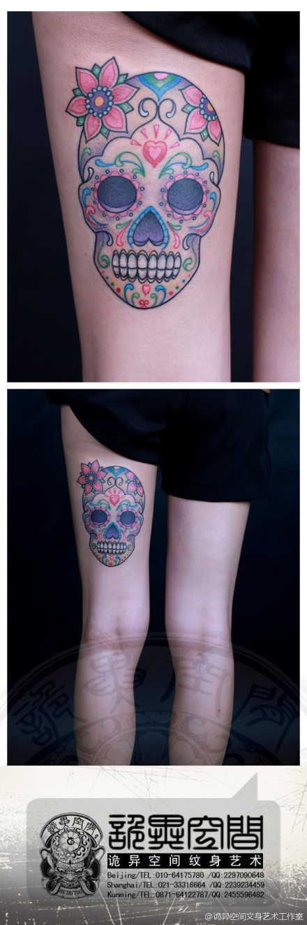 女生腿部潮流精美的欧美花骷髅纹身图案
