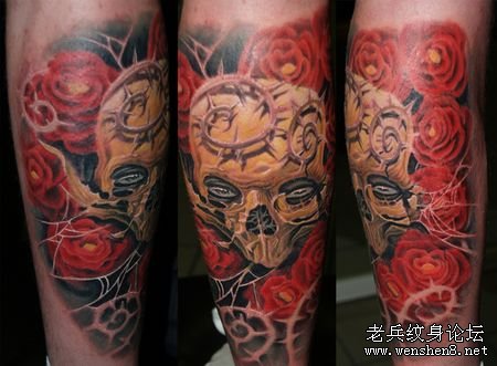 一款腿部欧美彩色骷髅玫瑰花纹身图案纹身图片