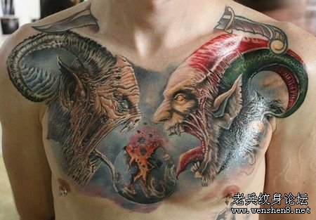 一款胸部欧美3D彩色恶魔纹身图案纹身图片