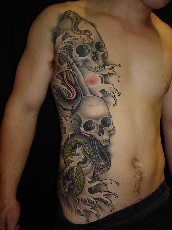 武汉文身店:侧腰欧美骷髅蛇纹身图案图片