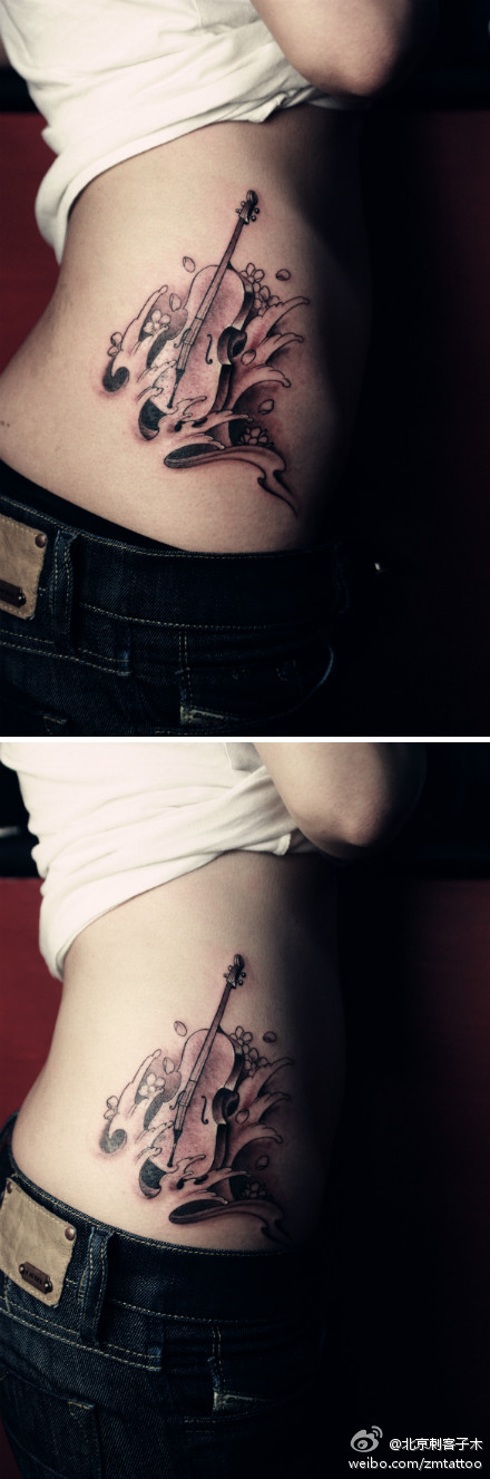 女生腰部唯美时尚的小提琴纹身图案