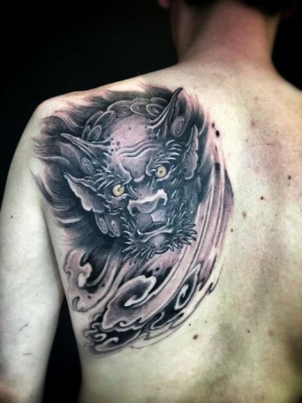 男人后肩背很酷的唐狮子纹身图案