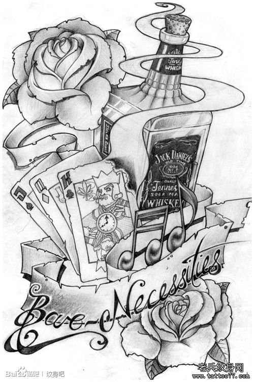 一款时尚经典的玫瑰花威士忌扑克牌纹身图案