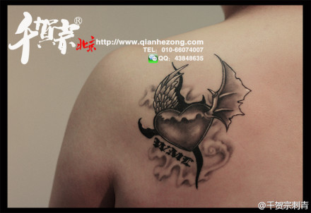 肩膀处时尚潮流的黑灰爱心翅膀纹身图案