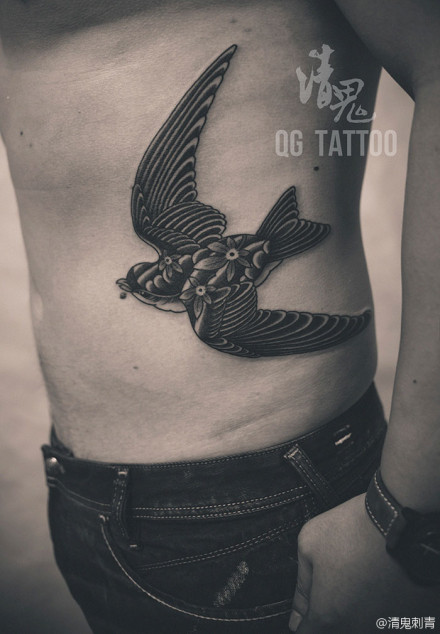 男生腰部潮流时尚的黑灰燕子纹身图案