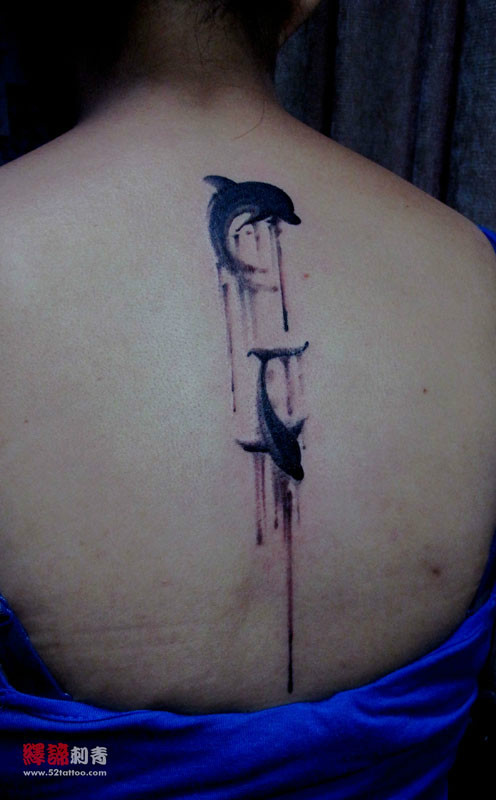后背时尚经典的水墨海豚纹身图案