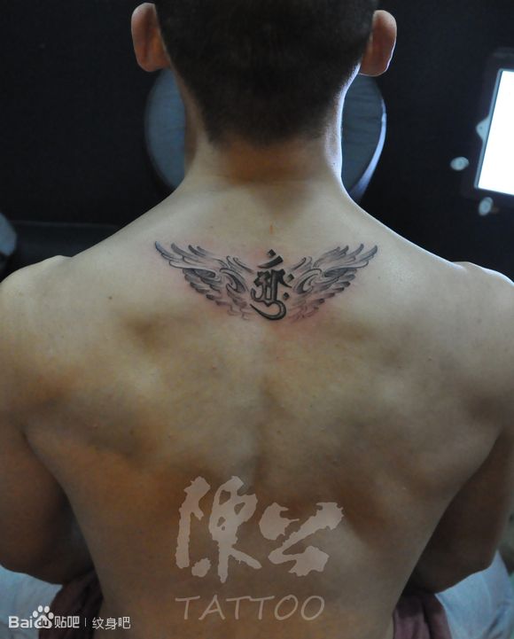 男生后背经典时尚的翅膀与梵文纹身图案