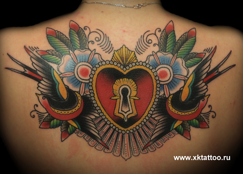 女生后背经典好看的彩色爱心锁纹身图案