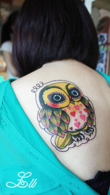 女生后背可爱潮流的一款猫头鹰纹身图案
