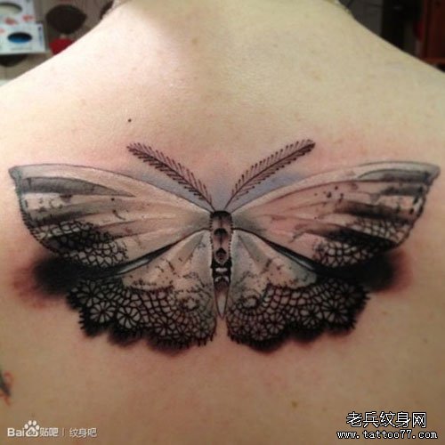 女生后背唯美经典的蕾丝与蝴蝶纹身图案