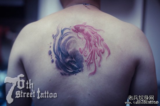 后背漂亮唯美的彩色水墨鲤鱼纹身图案
