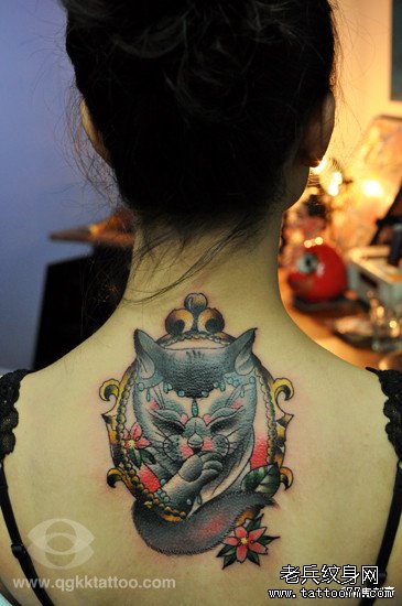 女生后背一款可爱潮流的猫咪纹身图案
