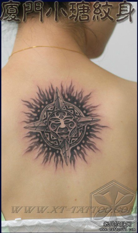 后背一款潮流时尚的部落石雕太阳纹身图案