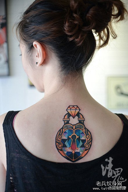 女生后背精美的钻石锁纹身图案