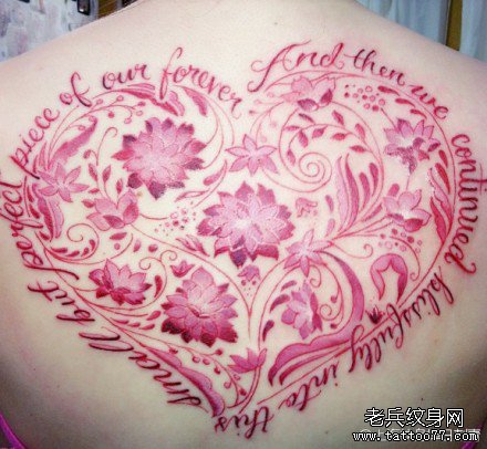 女生后背精美时尚的爱心花卉字母纹身图案