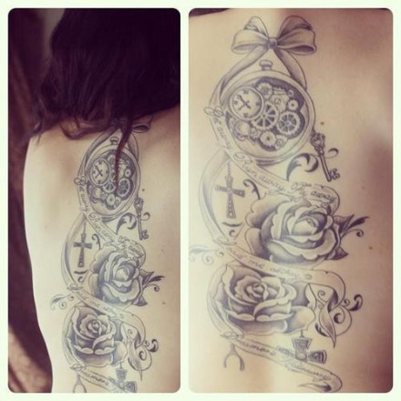 女生后背唯美经典的黑灰玫瑰花与怀表纹身图案