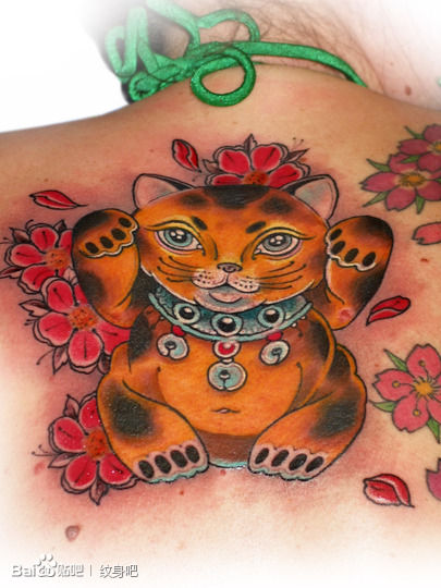 女生后背经典时尚的招财猫纹身图案