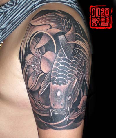 湖北恩施纹身店推荐一款大臂黑白传统鲤鱼莲花纹身图案图片