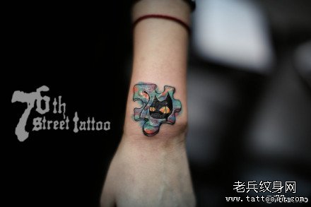 女生手腕可爱经典的拼图与猫咪纹身图案