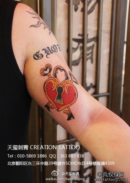 手臂内侧经典时尚的爱心锁与钥匙纹身图案