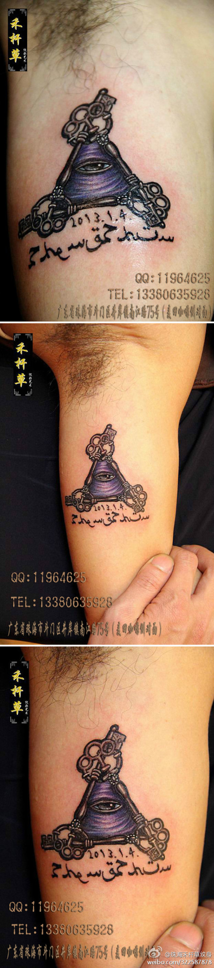 手臂内侧潮流很酷的上帝之眼与钥匙纹身图案
