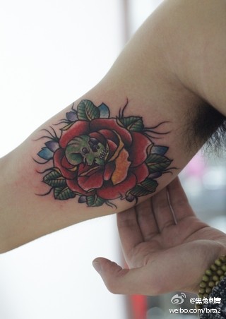 手臂内侧潮流唯美的玫瑰花与骷髅纹身图案