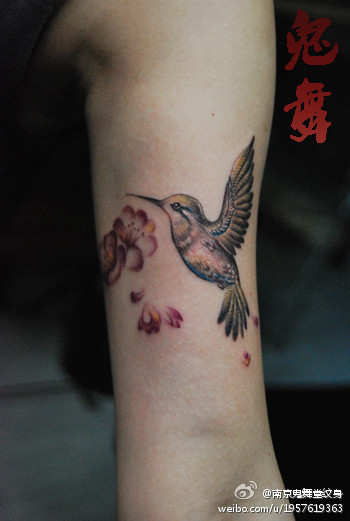 女生手臂时尚潮流的彩色小蜂鸟纹身图案