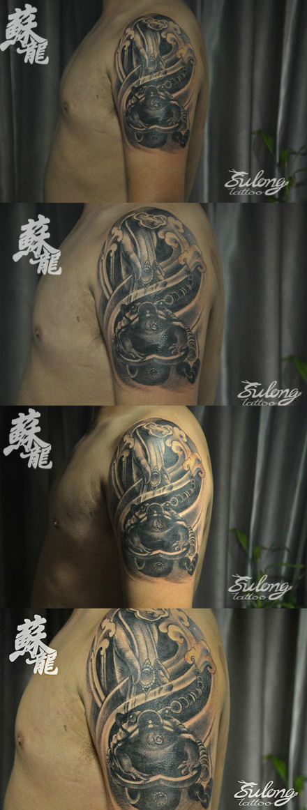 手臂经典的黑灰佛手如意金蟾纹身图案