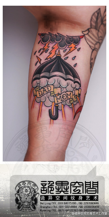 手臂潮流经典的雨伞乌云闪电纹身图案
