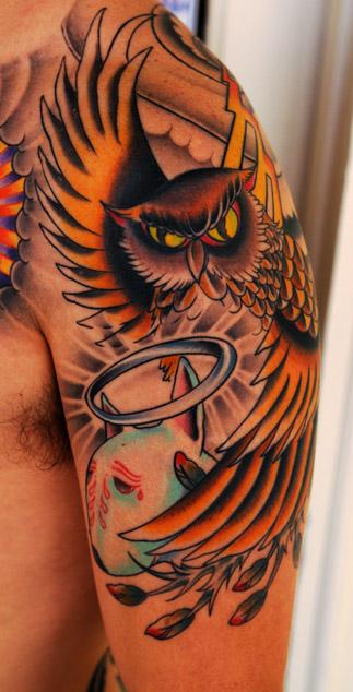 武汉最好的刺青店提供一款大臂彩色猫头鹰纹身图案