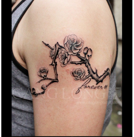 手臂唯美潮流的黑灰梅花纹身图案